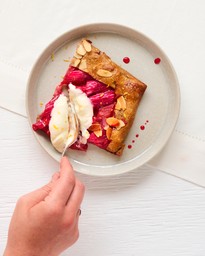 This Lattice Rhubarb Galette with Almonds is the perfect blend of rustic charm and vibrant flavors. Adding a layer of strawberry jam underneath the rhubarb enhances the tart rhubarb with a touch of sweetness, making this dessert irresistible.